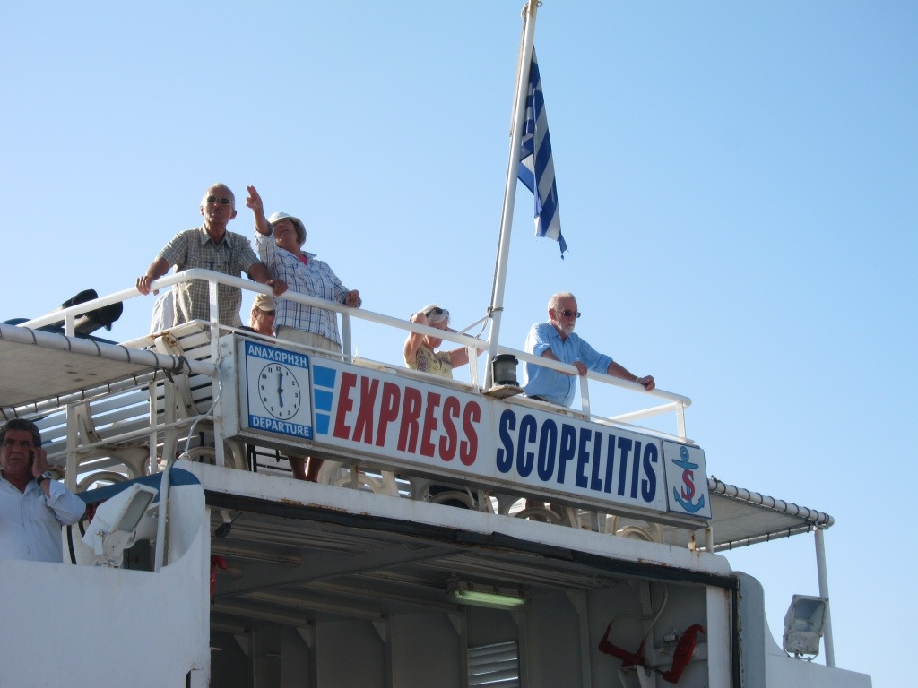 Our slow express ferry the Skopalitis Express arrived at approximately the scheduled time of 4:45pm, and awaiting on the dock for the disembarking passengers were the usual mob of Domatia Kamaki ( a Kamaki is Greek for harpoon, so Kamakia are the harpoonists waiting to catch someone to rent one of their domatia , rooms ) We were expecting Andonis himself, so were looking for a large ( I’m now being tactful) dark man….on asking around for him, we were instead directed to a tall skinny youngish looking guy…cigarette in mouth, and waiting beside a clapped out mini van…. ” you’re obviously not Andonis” I asked in Greek, to which he replies, in English, ” no, I am Florian”. ” Για σου Florian, Από που είστε; ” I ask….where are you from? …
