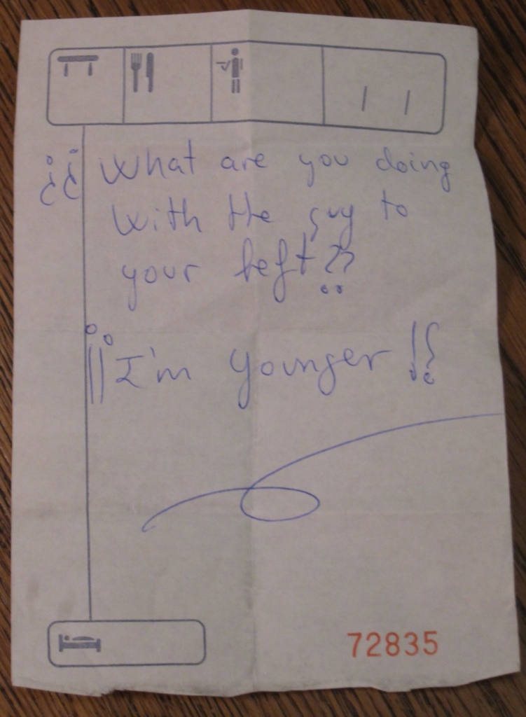I then told him about GP bragging about her note from the waiter, and that we were arguing over whether or not it had been meant for GP or him… ” Just a sec” says BL, ” I'll wake him up and ask him!!!!!”