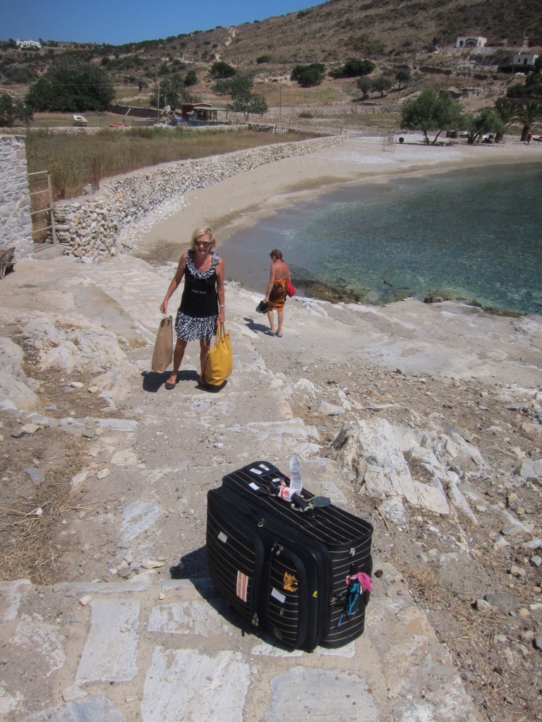 It was a good decision on his part, and about 15 minutes later we were hugging the coastline of Naxos, we were in the lee of the island…and the seas became calm…. we turned into a beautiful small horseshoe shaped bay named Panermos, ringed by palm trees and beaches…..I could see a taxi waiting up on the cliff, and on the beach the cab driver was waiting to help us disembark. Costas told me to go below and haul up our luggage, and while this was happening, and unknown to me of course, he took the opportunity to say goodbye to YM with big hug ( a BIG hug!) and a big kiss ( a BIG kiss!) …. I dragged our suitcases to the bow of the boat, and Costas pointed the boat towards a small concrete 'landing'… no way could you describe it as a jetty. I paid Cap'n Costas the 50 euro, plus a 10 euro tip….I doubt that anyone else would have gone to sea in those conditions for a mere 50 euro…. and now he had to make the journey back to Koufi …. and this time sailing INTO the wind. Thanks Cap'n, for helping us out of a real dilemma…. I passed my luggage down to Nick the cabdriver, and he then helped me as I clambered over the side of the boat. With Costas pushing, and me pulling, we manhandled Yineka-mou over the side and on to dry land….well, a wet beach actually… 'επιτέλους φτάσαμε με ασφάλεια' meaning 'at last we arrived safely' …. “Don't speak to soon son” I remember my Dad telling me often enough.