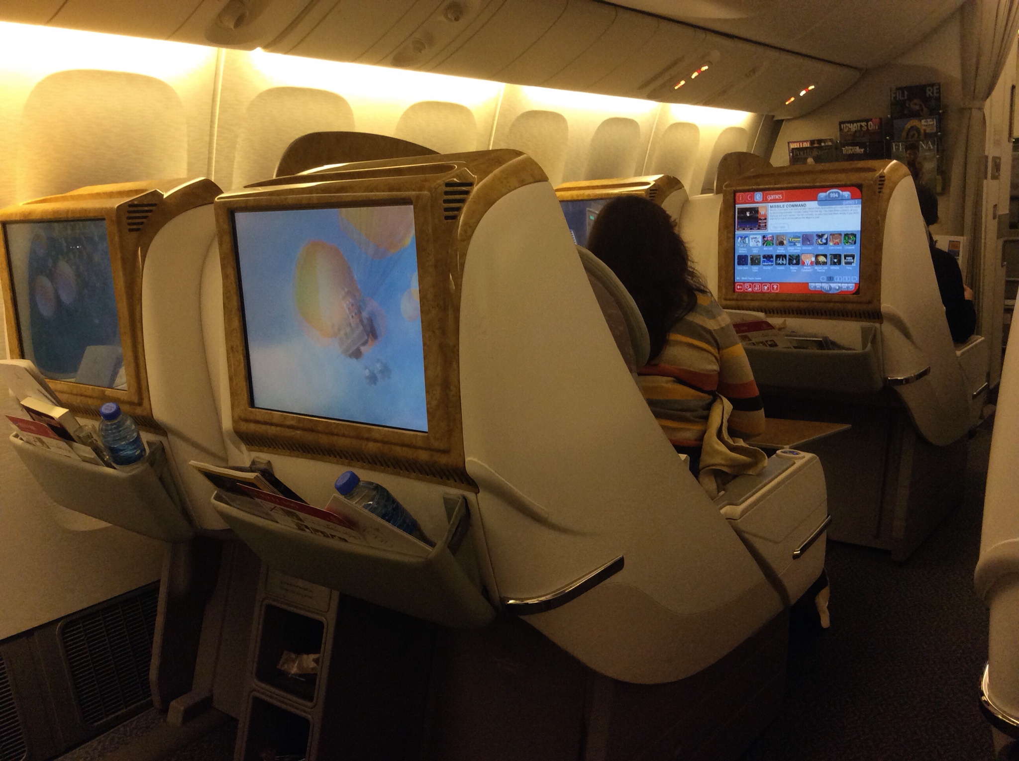Onboard now, as I write this, and although not Emirates latest plane ( it is a bit old) still very comfortable up at the pointy end…. it’s a full flight too, so very pleased and happy that we aren’t esconsed at the back with the mob.