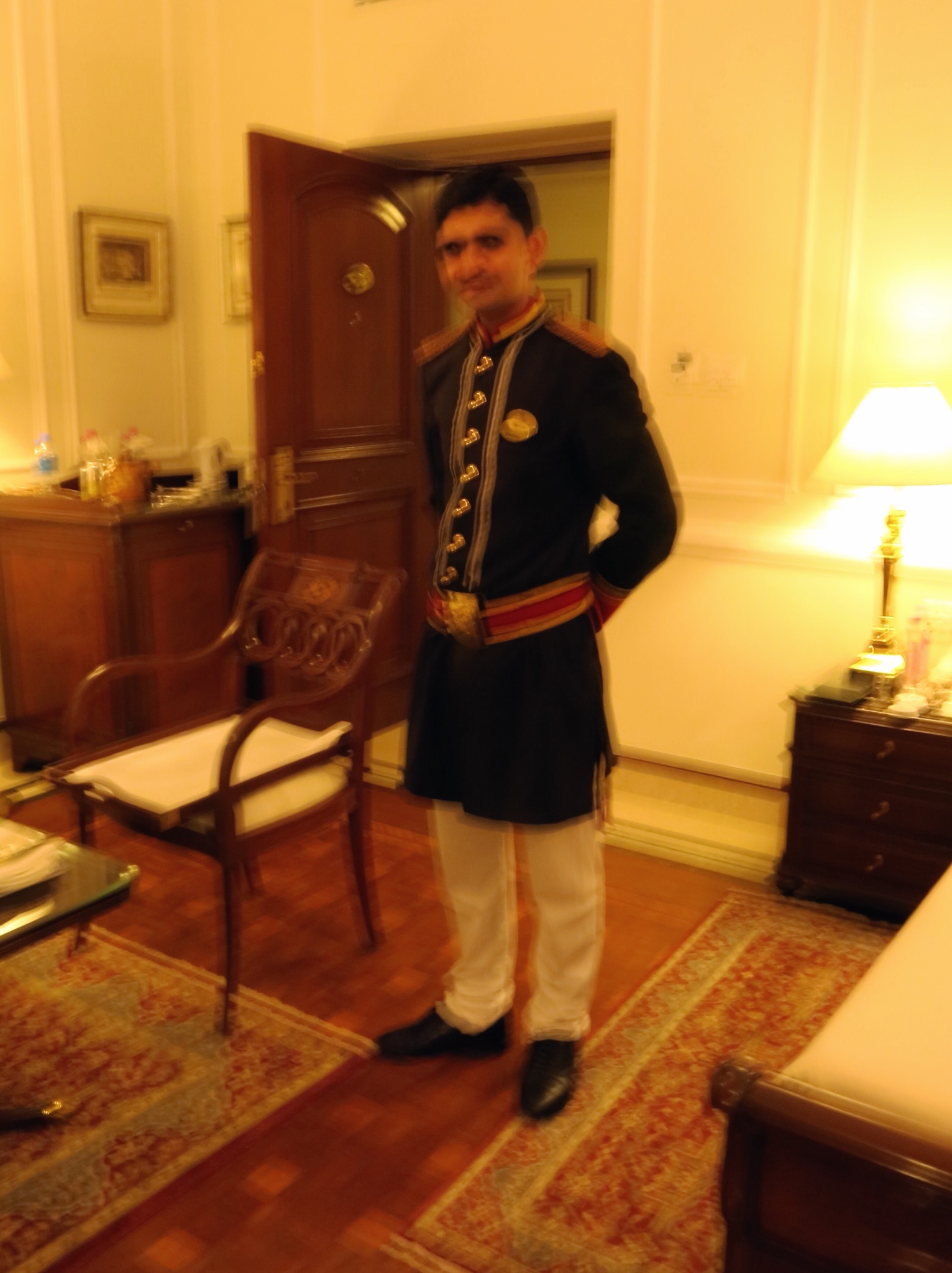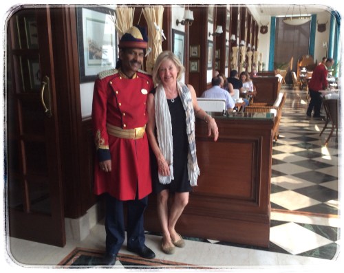 And 'The Imperial Hotel is all I imagined it would be….. very grand, but tastefully understated in the BEST British tradition…. the days of the Raj. After the usual 'fandango' with the room…..where the desk clerk gives you the worst possible room in the hope you'll be stupid enough, or tired enough, to except it….( no chance with Memsahib!) we are eventually given a room we are happy with ( and have paid top dollar for) a 'Grand Heritage room on the top floor…. and it certainly is grand, almost a suite. First thing I do before unpacking is to order a bucket of ice from room service. A few minutes later a knock at the door….fast service, I'm impressed….. until I open the door to find a fellow standing there who is dressed in the uniform of a 19th century soldier wallah….. with an iron and ironing board ! I tell him he has the wrong room…… “No sir”…..wag of the turbaned head from side to side….. “you are ordering iron, I am thinking so ” …….I probably do need an iron, but right now my need for a Gin and Tonic ( with ice) far outweighs my need for a freshky pressed shirt. Those Indian tourist board adverts haven't lied …..”India, expect the unexpected”