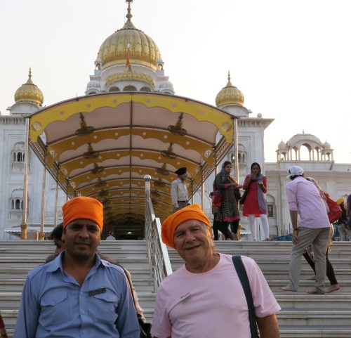 Our final stop on Dev's tour is to the famous ( well, not that famous, I'd never heard of it!) Sikh Temple, the Gurudwara Bangla Sahib. As I am not appropriately dressed, ( no head covering) Dev picks me out a bandanna type orange coloured cloth from a big communal bin at the entrance. I notice it's quite grubby and offer a silent prayer to Waheguru ( he's the Sikh God for thiose who dont know!) that the last devotee who wore it didnt have any head lice.