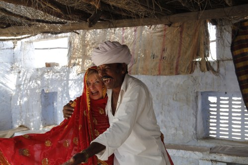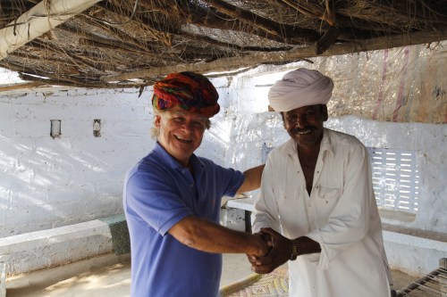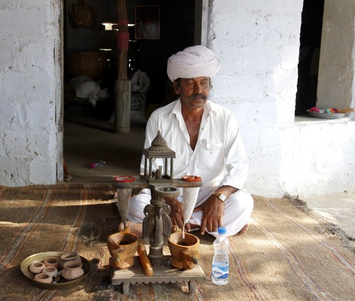 Our next stop is really facinating….. we drive through the countryside for another 20 minutes, down some very narrow roads tracks…. we are going to visit a Mr Brijal, who owns a small farm. The reason for our visit though is not to see his cows and goats, it’s because Brijal-ji is also an Opium Addict…. and he has ‘invited’ us to an Opium Ceremony. We are met at the gate of his property, a small cluster of ‘cow-dung’ thatched huts by a fine tall distinguished looking character, dressed in traditional style and with a white turban on his head. He sports a large white moustache also, and an even larger smile on his face, and I notice that his eyes are also smiling….and twinkling.