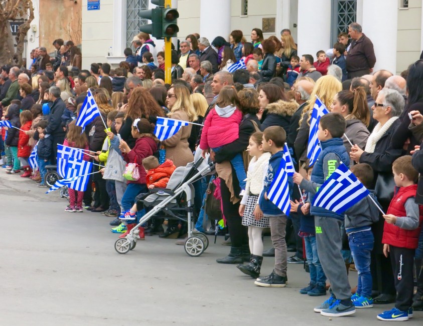 As it’s an Official Holiday today, the schools are closed as well as all the shops, offices banks etc…… some cafes, tavernas and restaurants are open, as are a few tourist shops around the harbour, but most everthing else is shut for day, Consequently the streets are very crowded, with lots of kids all waving the umistakeable blue and white striped flag of Greece… what a great atmosphere.