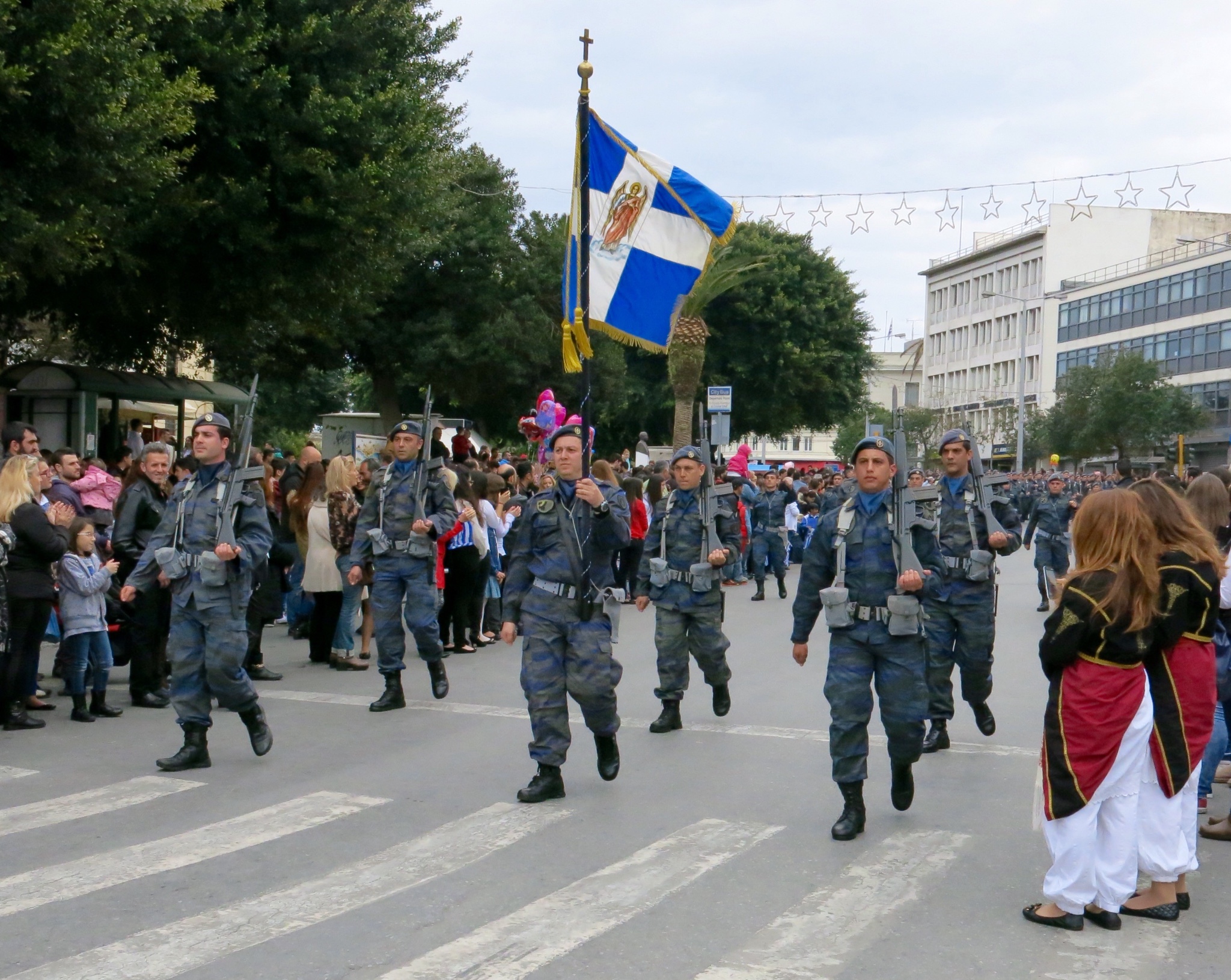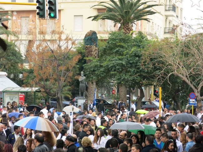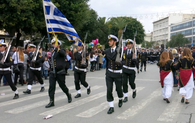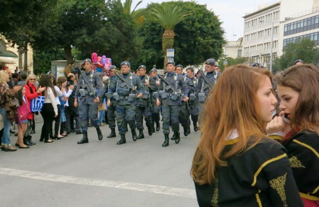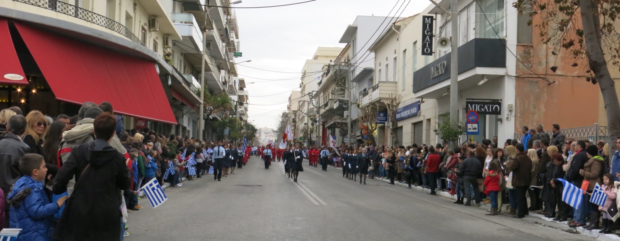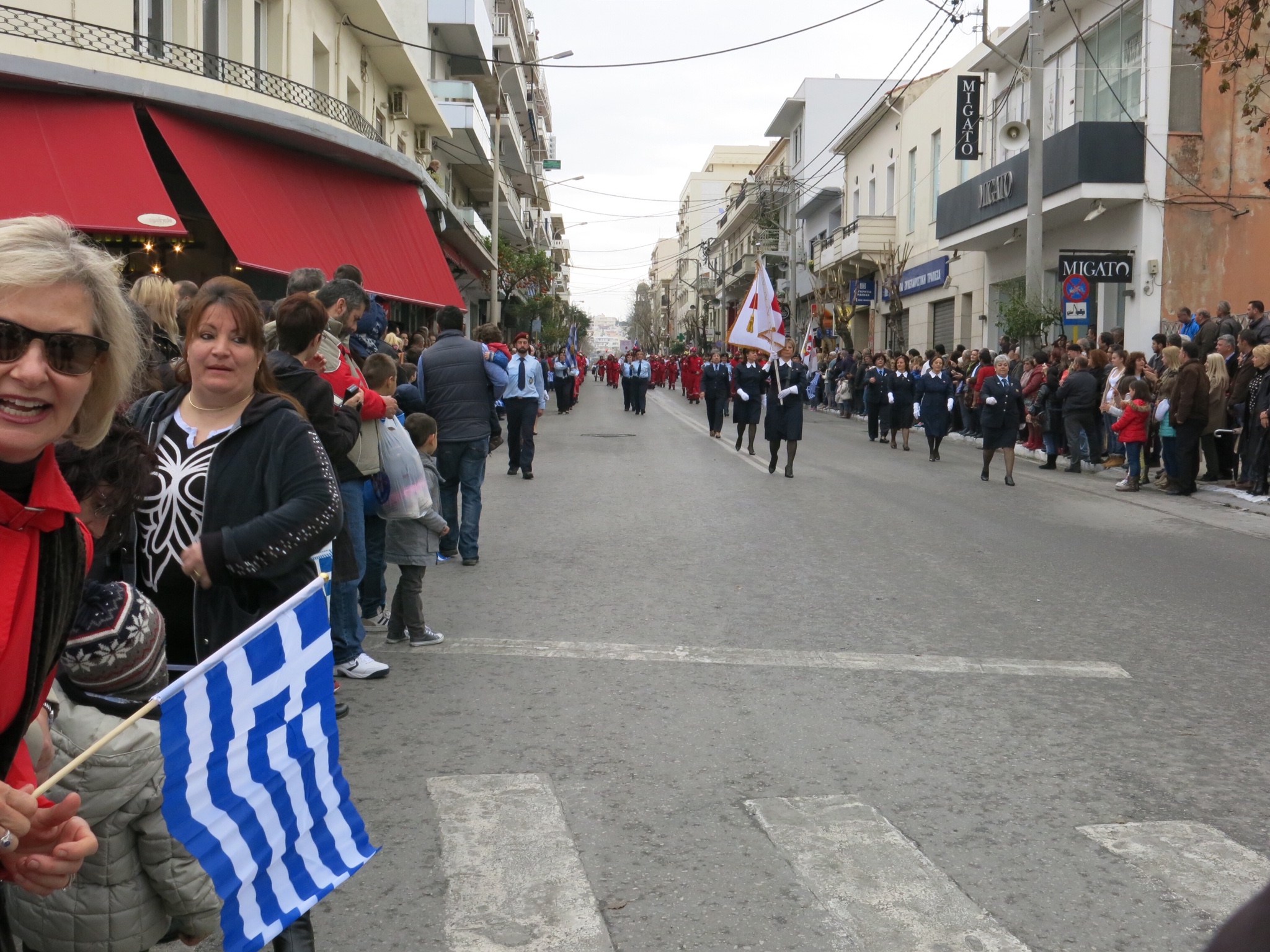 It’s a pity that the weather has changed, as yesterday was such a glorious sunny day. The church bells were particulary loud this morning and we awake to overcast sky’s and scattered showers….. but not enough to dampen our enthusiasm to go out and watch ‘i Parέlasi’… the parade. We’ve been told it starts at 12 noon from Platia Eleftherias, or as the locals call it, Dikastirio, but time is a flexible notion in Crete, and anyway, it’ll take the first lot of marchers at least 15 minutes to reach the town centre, so we dont leave the house till 11:45. It’s only takes us a five minute stroll to reach the parade route, and jostle with the crowd to take up our position at the bottom of Andrea Papandreou Street.