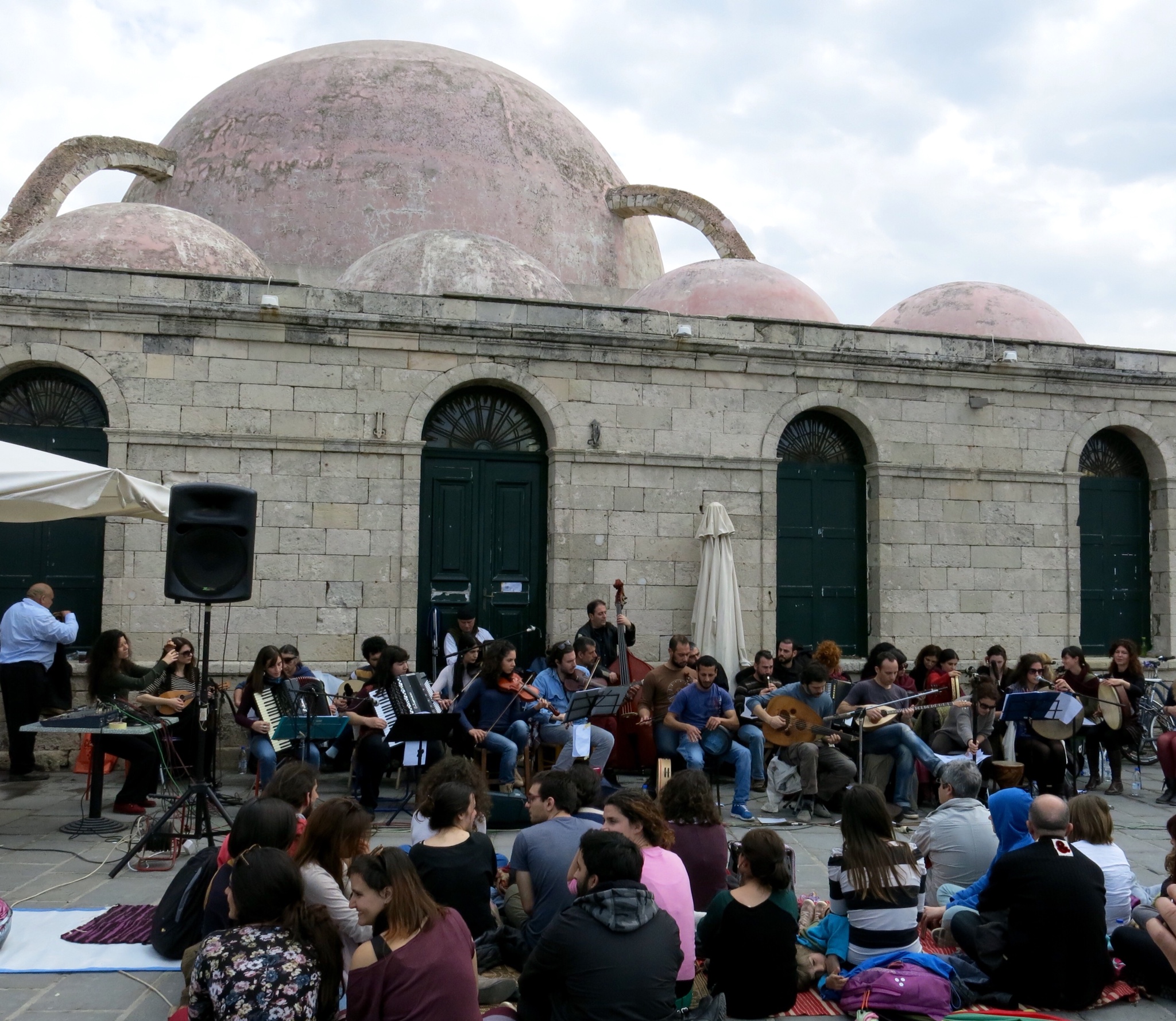 On the waterfront, outside the old building that at one time was a mosque when the Turks ran the joint, a large crowd has gathered to listen to a small orchestra playing and singing their traditional greek songs, so we stay for a while ourselves, until the rain puts a dampener on it.