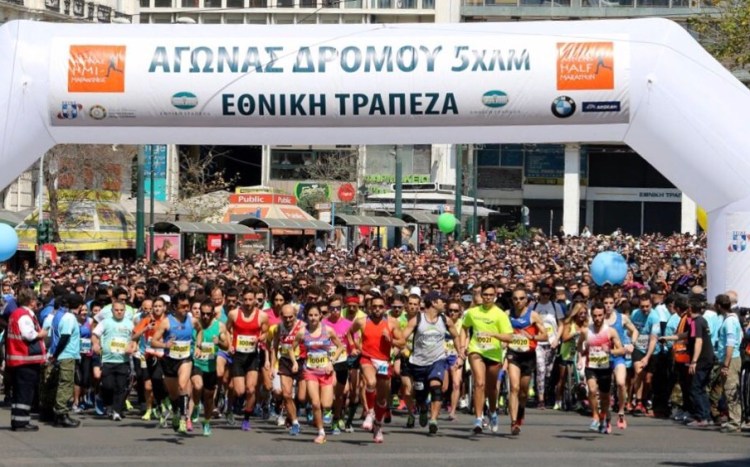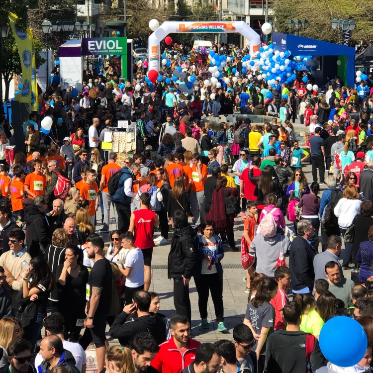 We set off at 9:30 to stroll the 20 minutes it’ll take us to reach Syntagma Square and where our event, the 5 kilometre race, will start at 10:45am. Even if you’ve never been to Athens, you’ll certainly recognise Syntagma Square in the centre of Athens. The dominant building overlooking the square is the Greek Parliament and it’s regularly in the news as the main site where all of the protest marches end up, many of them extremely violent. But not today folks, by the time we arrive the square is jam packed with a peaceful crowd. There are supposedly over 22,000 participants taking part in all the races, plus that many and more spectators. The atmosphere in the square is one of excitement and anticipation, and the Half-Marathon which started earlier, already has some of the leaders finishing, so YM and I join the crowds cheering them in.
