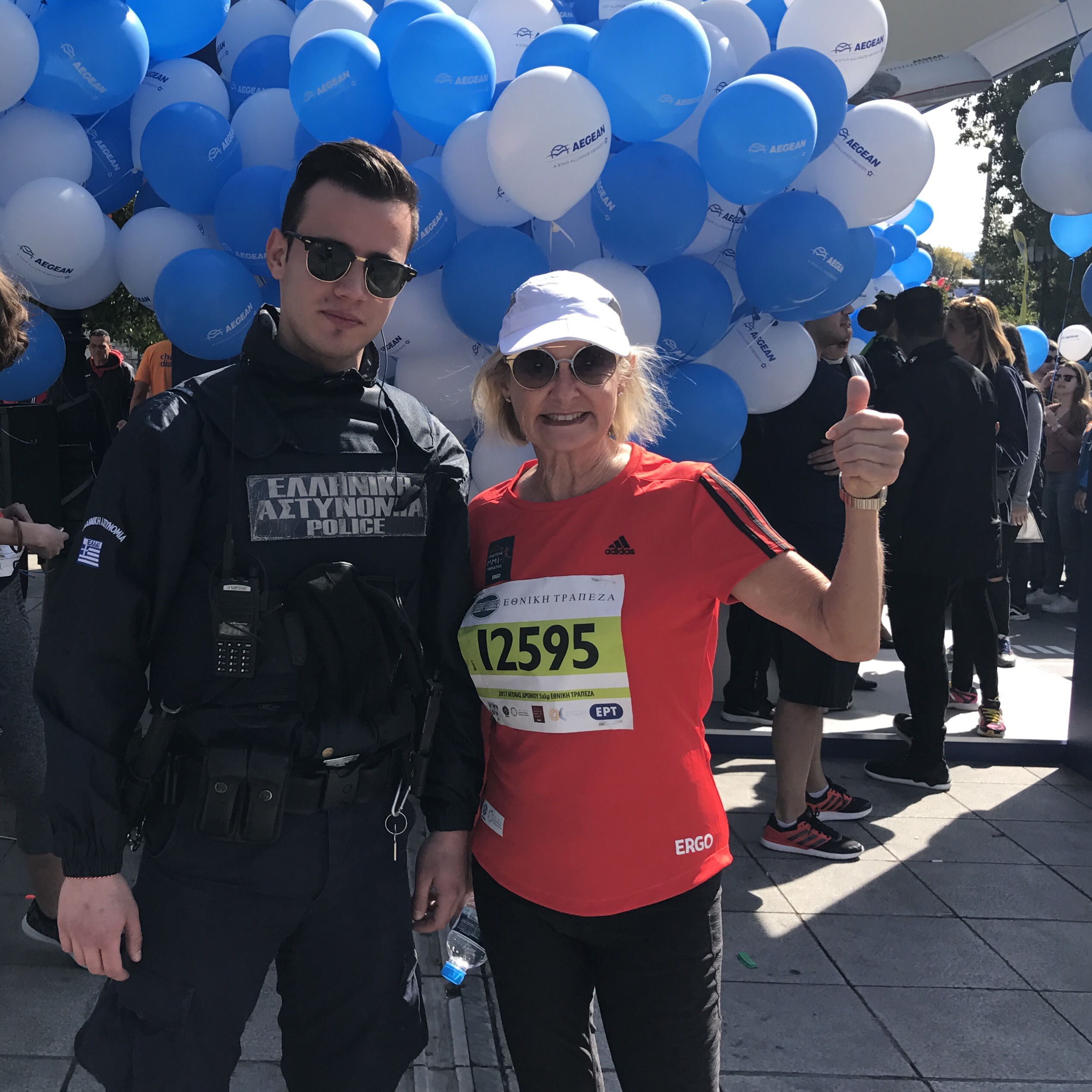 A few minutes before the start gun goes off, a group of young guys near us , obviously with ‘The Kefi,’ begin to dance in a circle together to the music of Theodorakis, blaring out from the loudspeakers in the square. It’s the famous ‘Zorba’s Dance’, and who can resist dancing to that number…. its infectious. Well, YM for one certainly cant resist, and she also starts to dance to Zorba’s , but solo….. until I have to warn her to save her energy, she’s going to need it.