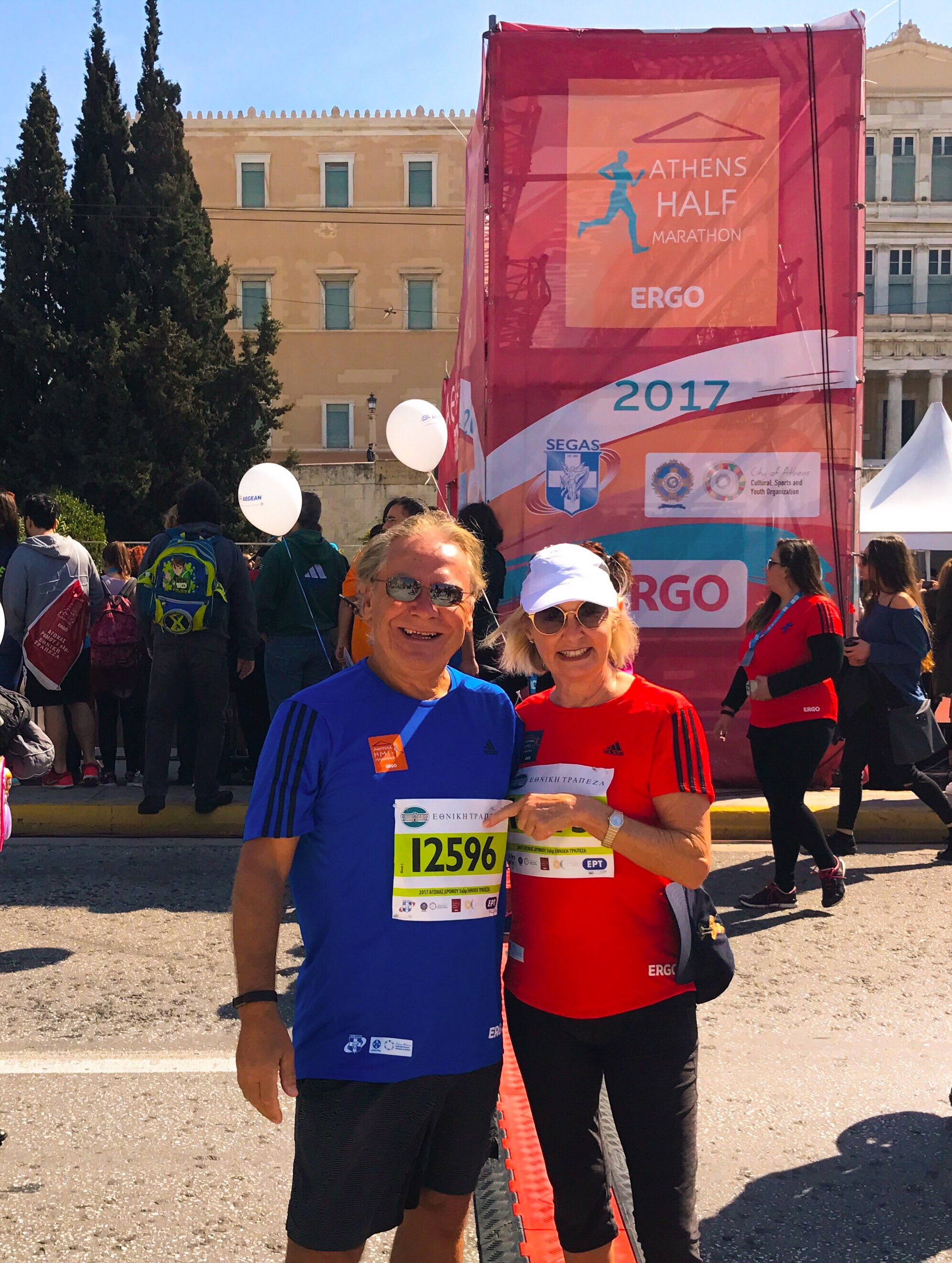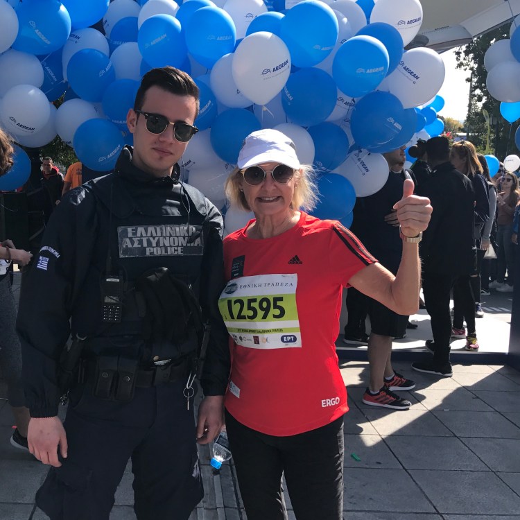 When the starting gun goes off, over 6,000 of us take off in waves….. YM and I have already agreed not to stick together….. she is faster than me…. but to run our own race, and so within a minute of the start I’ve already lost sight of her. My strategy is to jog any downhill section, and then to just stride it out on the uphill slopes and the flat. When I reach the first long uphill section on Vasileos Konstantinou Avenue, quite a few of the runners who had sprinted past me at the start, young girls mainly, are finding the going tough….. I think of the fable about the Tortoise and the Hare, and I begin to overtake many of them. To be honest, I’m really enjoying this, especially when I use a particularly attractive and shapely young lady in front of me…… she is wearing a pair of extremely tight tights, ( Tight tights? I guess they wouldn’t call them tights if they weren’t tight, would they?) ….as my pace maker. I even manage to keep up with her for about 10 minutes, but as soon as we turn left at the top of the hill into Avenue Sofias, she takes off like a dirty shirt, leaving me on the lookout for another attractive behind to follow. It really was a buzz to be running, and walking, along these streets, passing the historic buildings and monuments of this city. When I reached the road called Panepistimiou and saw the magnificent Academy of Athens buildings on my right, I knew I’d nearly made it to the finish, and with lots of spectators cheering and encouraging everyone along, I stepped up the pace, jogging it to the line, and crossing it like an older, shorter and fatter version of the ‘Deek’…. Robert de Castella ( Google it) . Glancing up at the stop-clock, I see that my time is 39 minutes….. what a surprise!