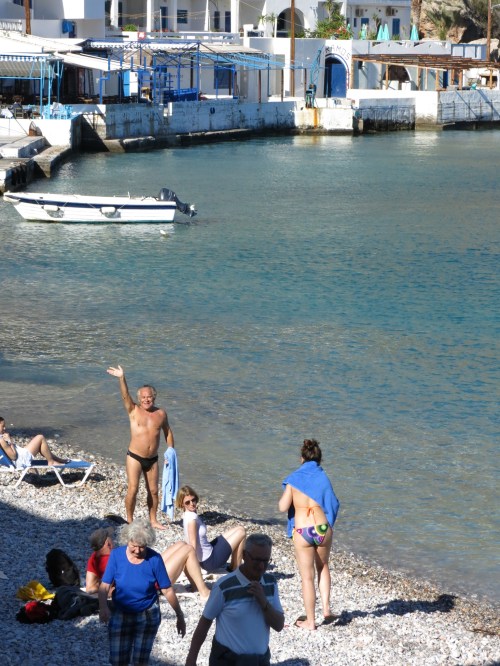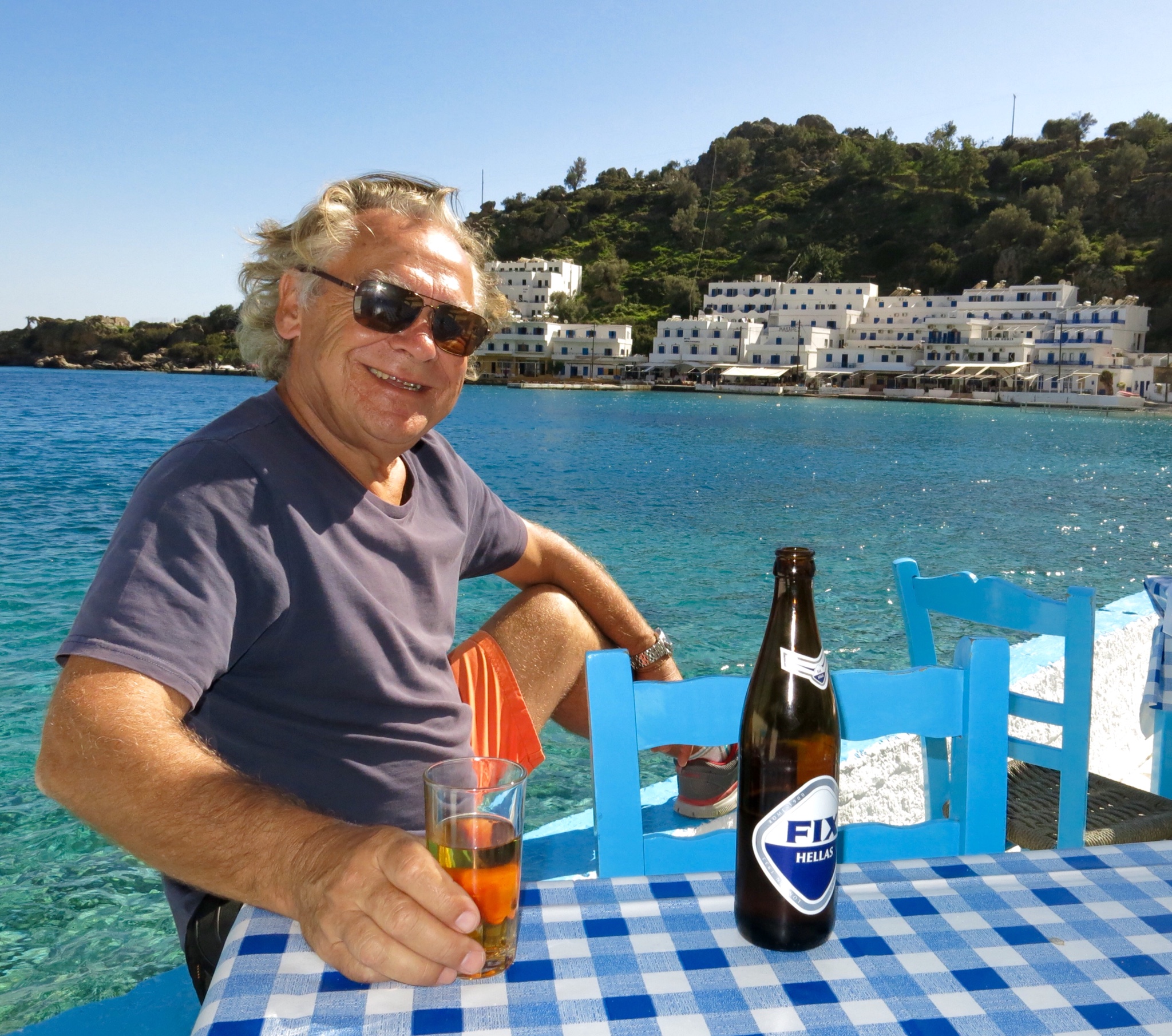 I’m really in need of a ‘Fix’ after making it back in one piece, after that awesome trek along the side of the mountain, and the terrace at Pauvlo’s Taverna is the perfect spot to have it ….. icey cold and goes down a treat….. not even touching the sides…… just as well that not every beer tastes as good as this first one or I’d more than likely become an old drunk! The weather this afternoon is just perfect, clear blue skies and the sun has a bit of a bite to it…. it warms your insides up. So it’s probably time for a quick swim, but for no other reason other than to say I did it. And as our hotel room is right on the beach, then why not.
