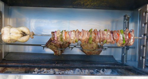 We were intending to spread the euros around a bit, by eating tonight at the only other Taverna in the village that is open right now, but having seen the dust that covers every square inch of the place…. and seeing as how they haven’t had a single customer there all day…. (Is it just me, or is the Mousaka a wee bit gritty today, Yianni…) our two “Texans” and us opt to go back to Pauvlo’s Taverna again, at the opposite side of the bay for some more of his excellent spit- roasted specialities…the rooster looks particularly good, and is.