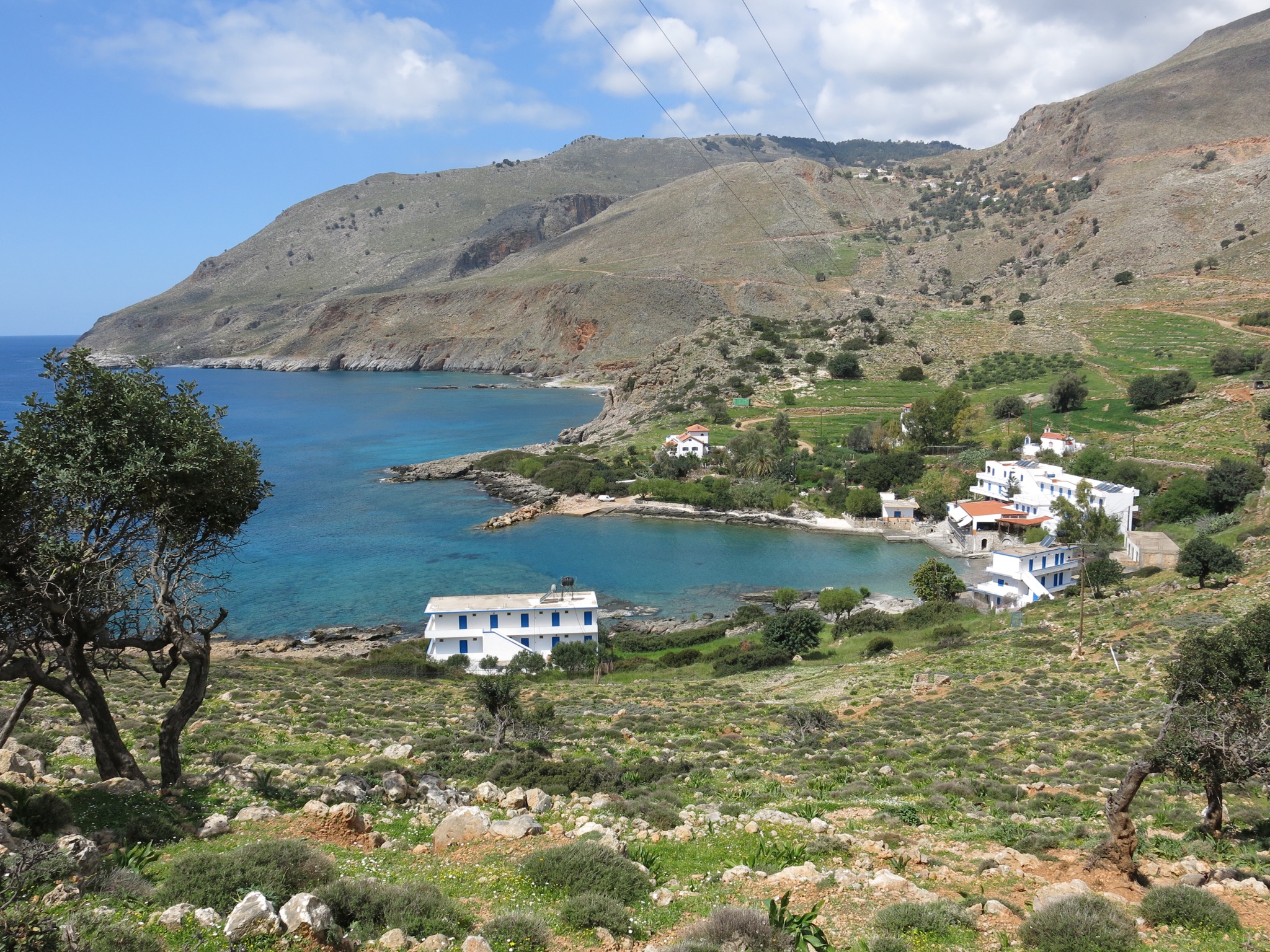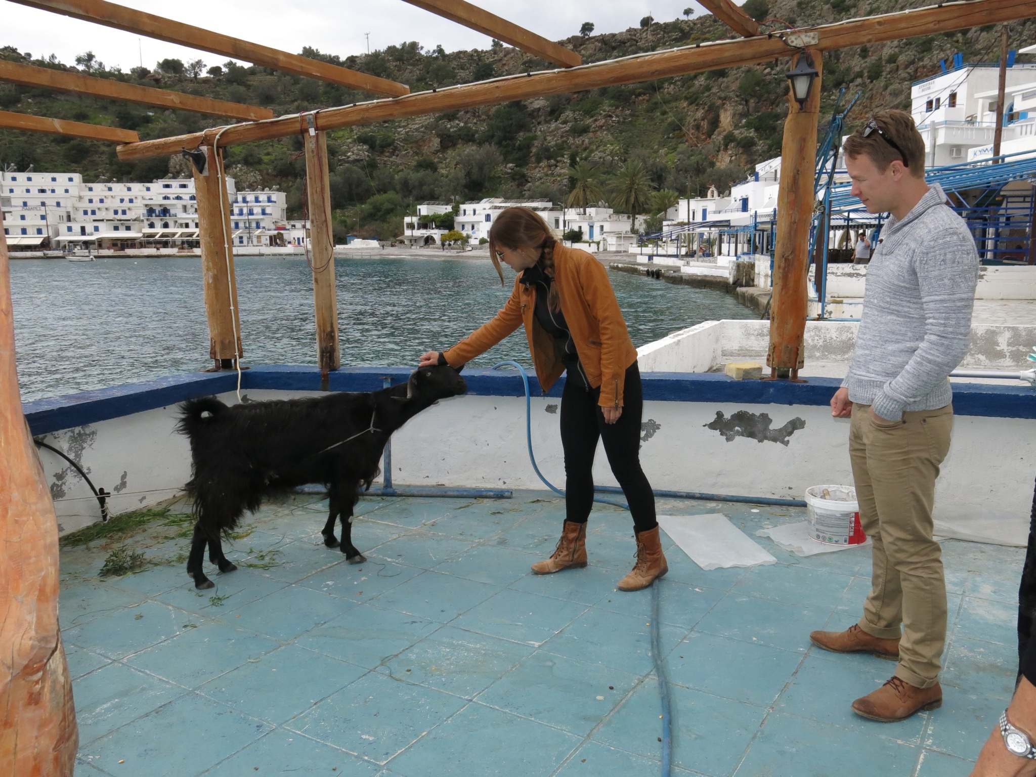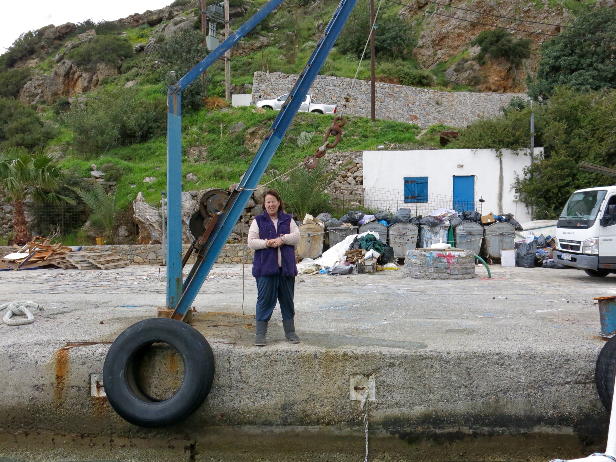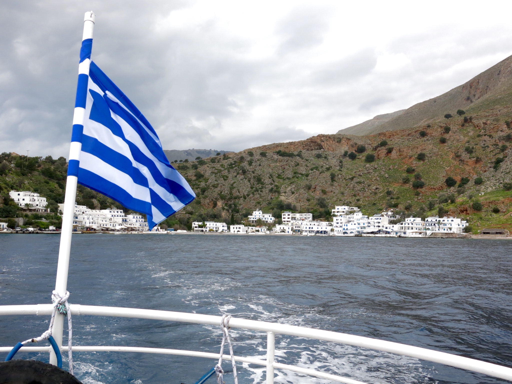 Tomorrow is Easter (non-orthodox) Sunday, and we all discuss the possibility of staying another night in Loutro….. And if the weather is still good when we wake up, then will we stay. Come morning, and the sun is shining brightly in a clear blue sky, and so the decision is made that after breakfast we will tell Allison that we intend to stay for one more night. I’d just finished eating the last piece of Easter cake on my plate, when it started again. “MOLLY…. What the heck… I thought the man with the white beard told you that they weren’t coming back” …. ” was his name Nick?…. Saint Nick by any chance Molly ?” Any thought we had had about staying disappears as quickly as a proverbial rat up a drainpipe, as we hear familiar tune rat-a-ta-rat-a-ta-rat-a-ta-tat playing on the pneumo drill . Allison appears on the terrace looking distraught, and goes around to each of us guests to personally apologise for the racket, but poor thing, it’s not her fault ( I blame Molly and the mallaca with the white beard). The small ferry boat, passengers only, no cars or trucks, is due to leave at 12:10, so that’s what us and the Texas Rangers leave on…. and leave the noise, and Molly and her lovely family, behind. We board the small boat, just as Allison comes along to wave us goodbye, and she admonishes me for not giving her a farewell hug! Being the gentleman that I am, I hop off and give her my special ‘ bear hug’ …. a not inappropriate description. I can’t help but notice that she hasn’t shown the same degree of affection towards our Texan friends….. Lucky them!