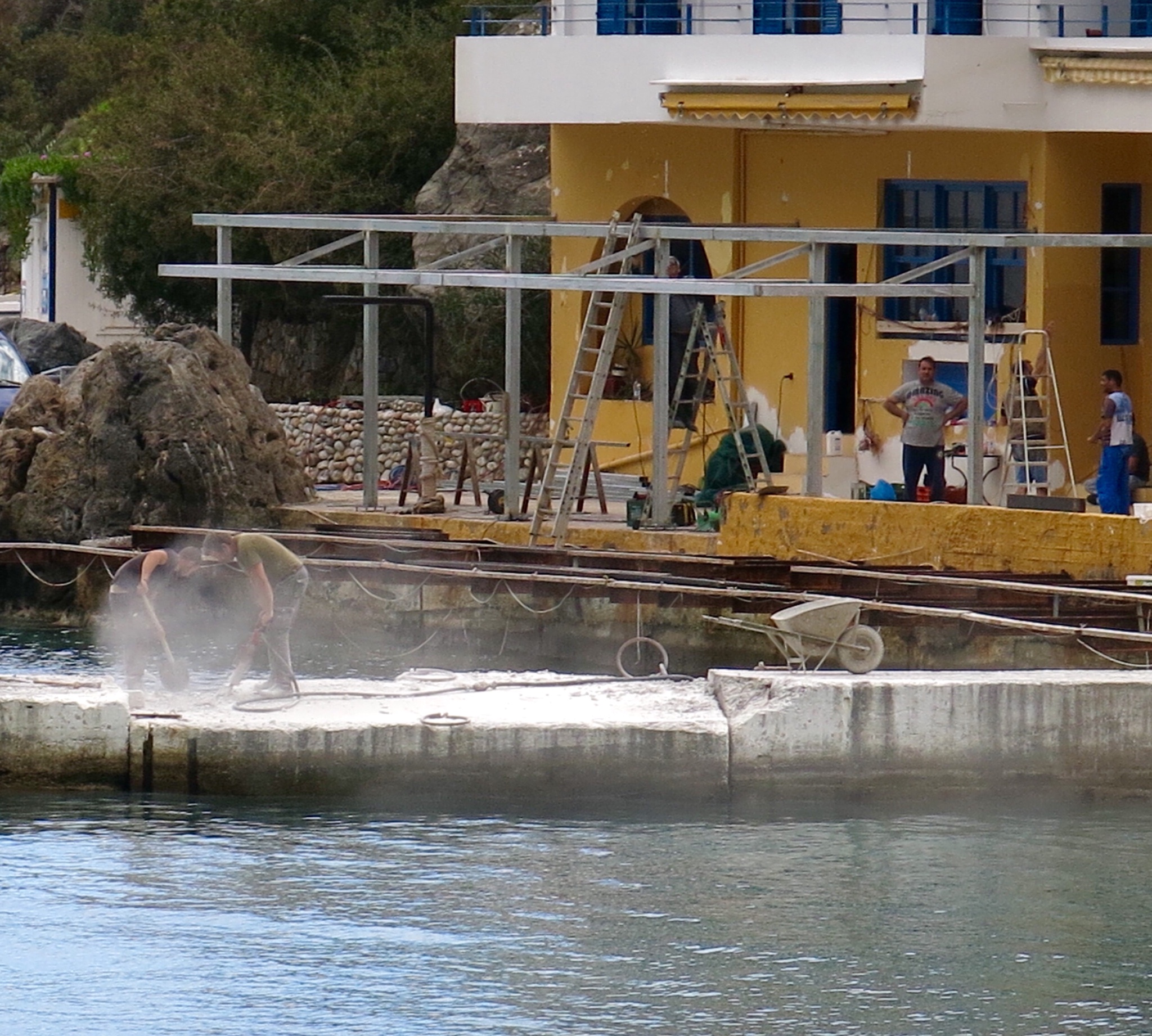 The next morning we awoke to the sound of a pneumatic drill echoing around the bay…. The Mallaca’s had chosen Easter ( non-orthodox) Weekend to decide that now would be an appropriate time to demolish part of the ‘newish’ concrete jetty that they had only built last year…..a part of which had sunk lower in the middle section due to the severe winter…. or just plain shoddy workmanship. The noise from this drill was unbelievably loud, amplified by the shape of the bay and the mountains surrounding it!