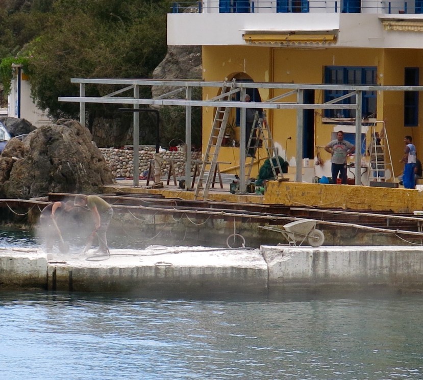We then met young Irish Molly outside the hotel, who assured us that she had spoken to someone…. ” who Molly?” … ” oh, he was a grey-haired old man with a white beard” she says….who had told gullible Molly that they would be finishing at 6 o’clock and would DEFINATELY not be coming back again tomorrow. ” Definately not Molly?” …. “Oh no, definitely not” she assured us! Well Molly was right, because at 6 pm they stopped drilling, pushed what remained of the rubble from off the jetty and into the water and retired to the dusty taverna for a beer, while waiting for the ferry to take them back to wherever they were from. Once again, Loutro slipped back into the peaceful, tranquil, quiet place it is renowned for.