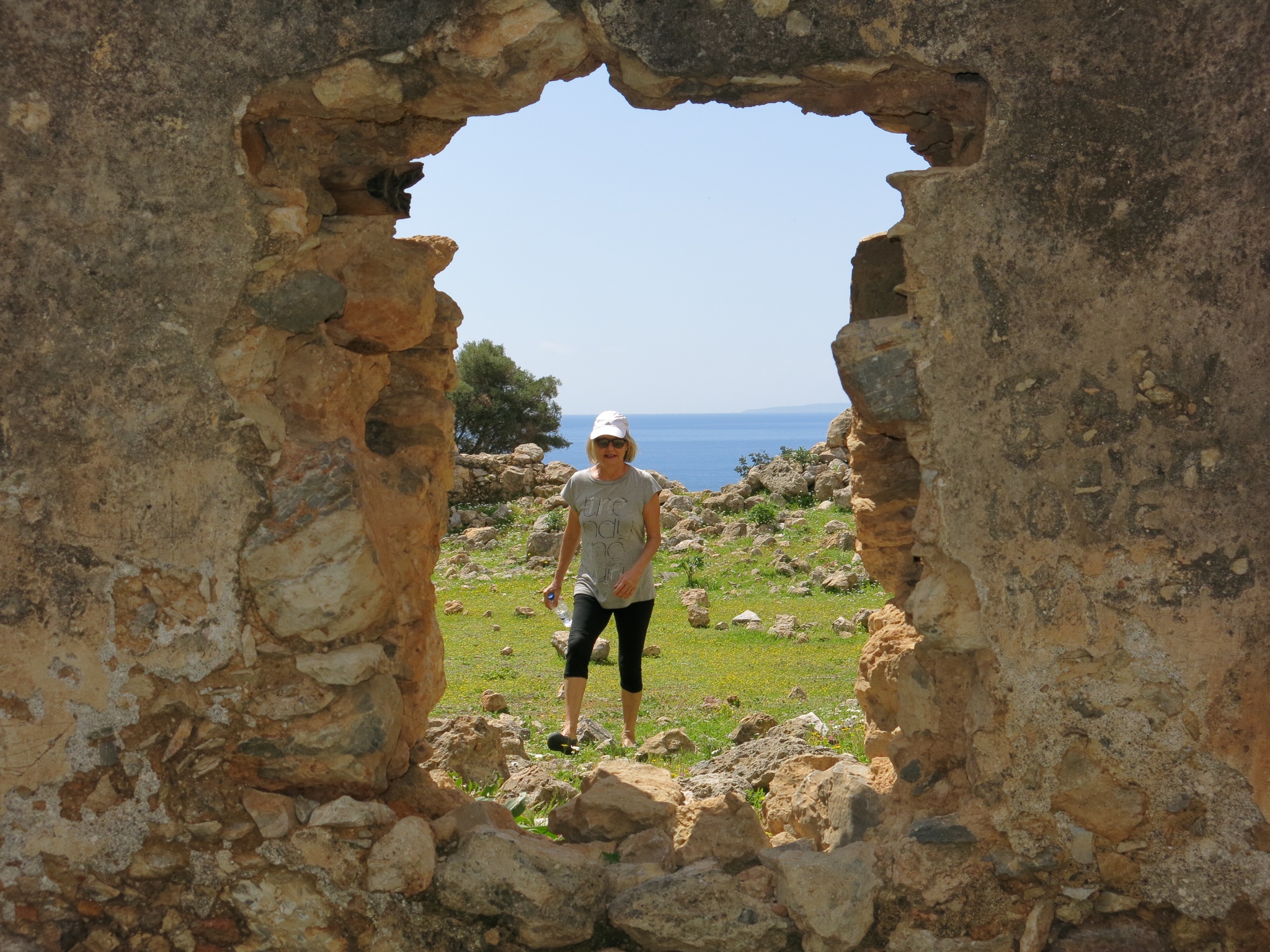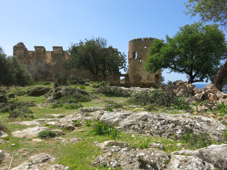 By the time we reached our hotel it seemed it was the the main topic of conversation in the village amongst the visitors…with everyone asking when it was going to stop. Apart from Allison, the other locals seemed quite oblivious to the noise, and even the guy who ran the taverna close by to the destruction going on didn’t seem overly concerned, even though his table and chairs….and his Bain-Marie…. were covered in a thick layer of grey concrete dust. I ought to point out also, that neither of the two workmen doing the drilling were wearing any sort of protective clothing….not even a dust-mask or earmuffs…..and the rubble caused by the destruction of the jetty was simply pushed into the harbour! To get away from the noise, YM and I hiked back over the hill towards Phoenix ( …she’ll be waiting….) and when we reached the old ruined fort above the cliffs we found peace and quiet again…. Bliss.