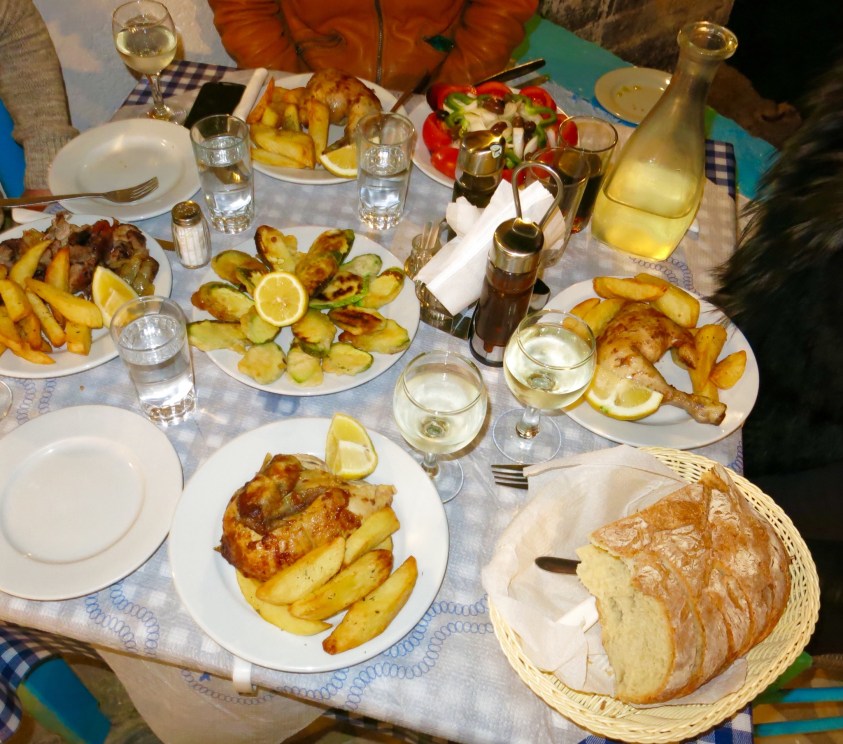 Eventually, but only after we finished off yet another bottle of ‘Aspro Krassi’ ( white wine) which Allison had stolen/ taken from her bar ( how does she make a profit?) the informal party broke up as we all made our way to dinner…. It was a race to to get there first too, as Pavlo’s only had one young kid turning around on the charcoal spit at his taverna , which wasn’t enough to feed us all…. and we didn’t want to be the ones to miss out. ….. it wasn’t as if you had an option to go anywhere else for dinner either. Kali Orexi.