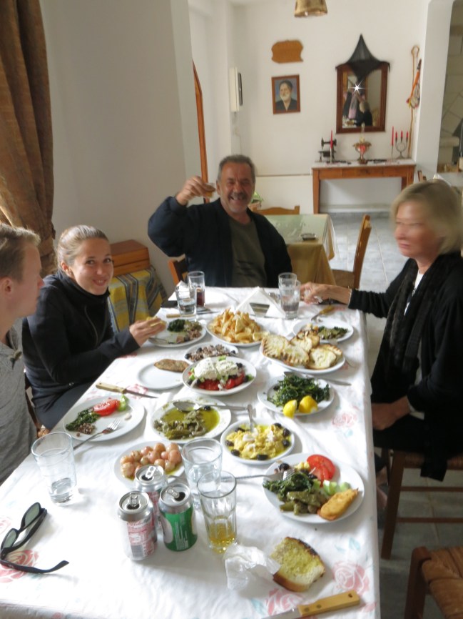 The owner, a lovely friendly bloke named Giorgos, doesn’t speak much English at all… even less than my Greek… so both Jauren and I put into practise all we’ve learnt…. or more to the truth, all we’ve remembered….from our Greek lessons at Kleiss Language School in Xania. Now I’m not sure if it was me or Jauren to blame, but we ended up with more food on the table than what you would normally see on a cruise ship buffet ….I’d describe it as a banquet….and not just that, but as soon as one dish was finished, Giorgos the waiter…. and chef, and owner… brought something else to the table…. until we had to tell him to hold it at that.