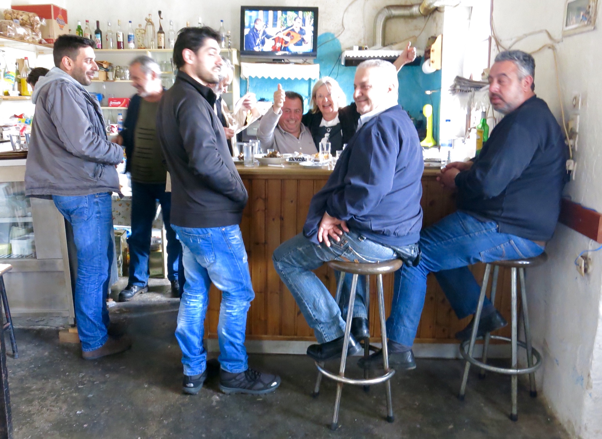No sooner have we settled in, and on our second glass of raki, than Stavros suggests (suggests…. no, that’s not his style…shouts) to us that we have to be going…. to see his other friends in an ouzeria ( it’s a taverna that specialises in Ouzo) just up the road. Resistance is impossible when you are being urged by a Cretan from Sfakia district, as the Germans found out the hard way in 1942, so best we don’t offer any resistance. The next taverna, sorry Ouzeria, is a real men’s bar….. All the good ole boys hang out there…. and when YM enters, it causes quite a stir. Introductions all around again, and this time the hugs that YM gets from the clientle of the Ouzeria seem to me to go a little beyond what constitutes natural friendliness….the Xenophilous…. that Cretans are renowned for. YM of course, laps up the attention, never mind that most of them are….. I was going to say quite old, but realise that I’m probably the oldest man in the place… not that young! And in true Cretan style most haven’t bothered to shave for the last week or so.. …designer stubble is de-ruigur in these hills. (it’s the law, remember) This time the Ouzo’s are on me, but as I’m driving I don’t have another drink myself. ‘Yetee’ they all ask, ‘why not?’ When I say I can’t because I’m driving it causes great laughs all around, and I’m informed that, Ella re, ehh, it’ll make you a safer/ better ( Kalitero) driver if you do have some more drinks!!! Mmmm….that explains a lot about the standard of driving ability hereabouts…. but I ignore their taunts and settle for a Ellenikos Kafes…. A greek coffee. If that doesn’t sober you right up, then nothing will.