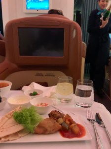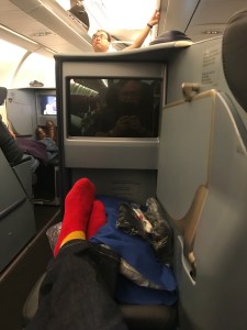 Wow, now this is more like it…..compared to the MH cramped cabin, this one is SPACIOUS….. and Luxe….and so comfortable. Service is top class, no complaints at all ( not even about lack of PJ’s, this is a daylight flight after all), and pretty soon we are taking off, and relaxing with the first of many glasses of French bubbles.