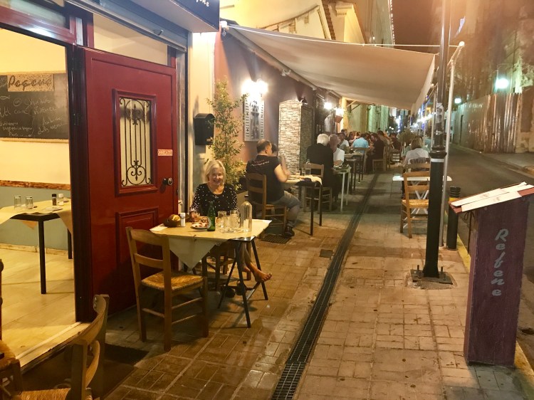 After a quick freshen up, we go for a stroll around the town, and on the way back to the hotel stop at a small, but inviting looking local taverna, where the tables and chairs are lined up along the pavement outside. Still busy, and still receiving customers at 11pm at night, not really hungry we settle for a simple Koriatiki Salata ( greek salad) chips and bread, plus a healthy dose of second- hand cigarette smoke, all washed down by a half a kilo ( a half litre) jug of Piraeus’s best house wine! Just perfect, it really feels great to be back in Greece once again!